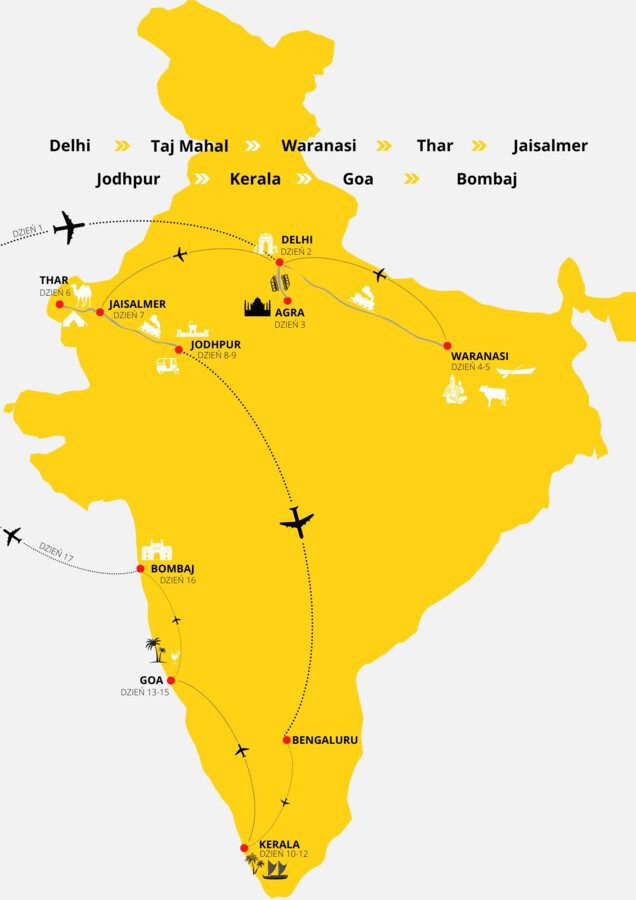 Wyruszamy w stronę Delhi lotem bezpośrednim (lub z jedną przesiadką po drodze). Jeśli jednak wolisz rozpocząć podróż z innego miejsca, nic nie stoi na przeszkodzie – możesz dołączyć do grupy na lotnisku przesiadkowym lub spotkać się z nami bezpośrednio na miejscu.