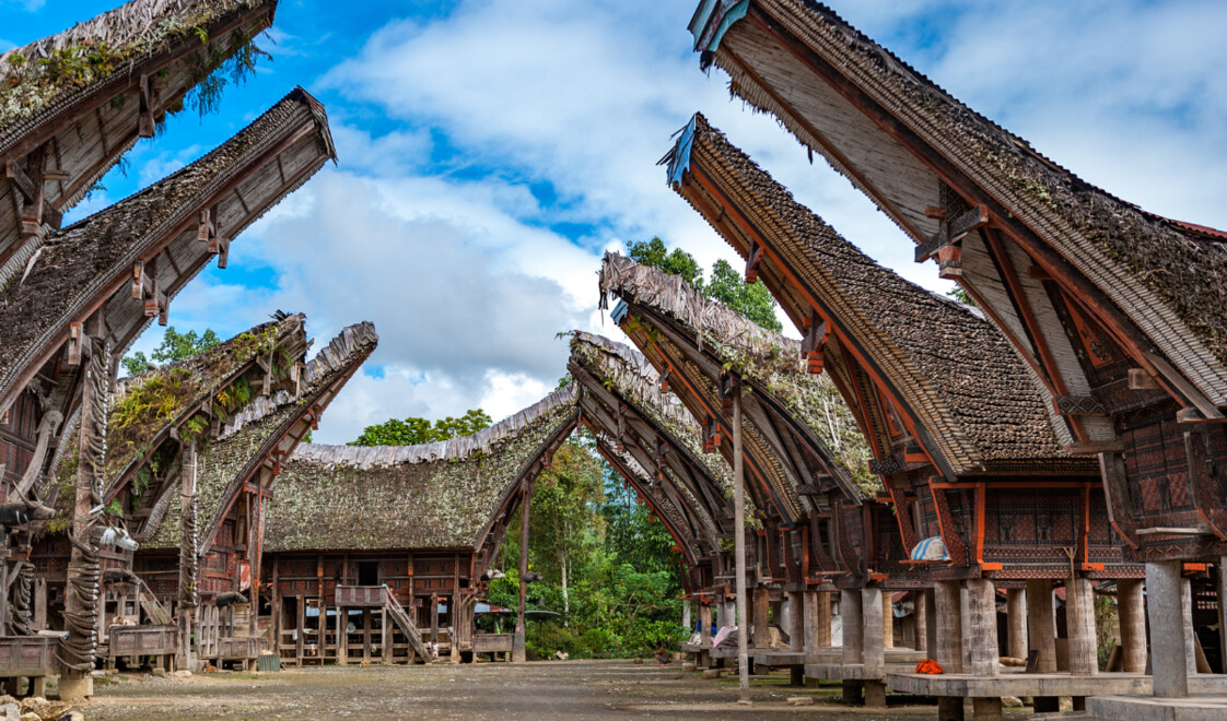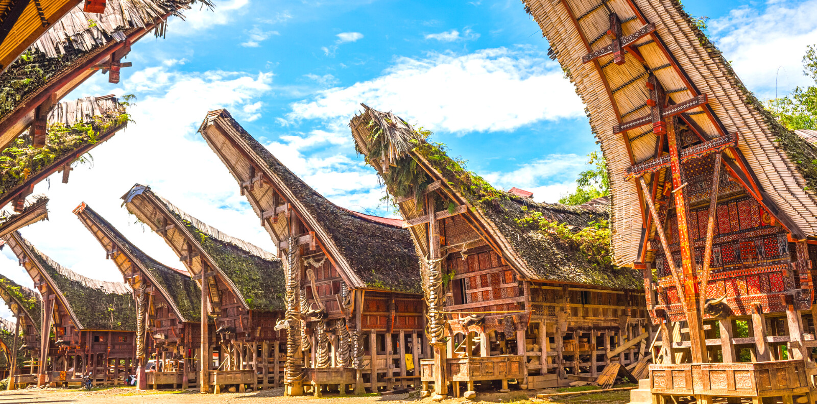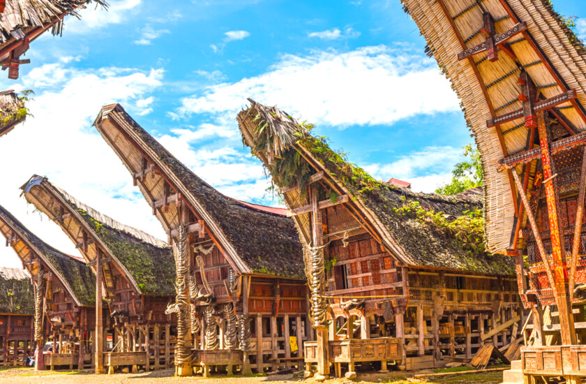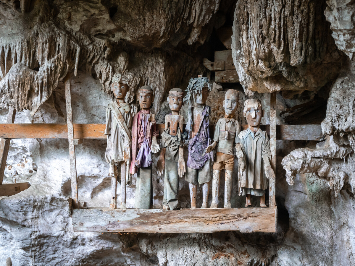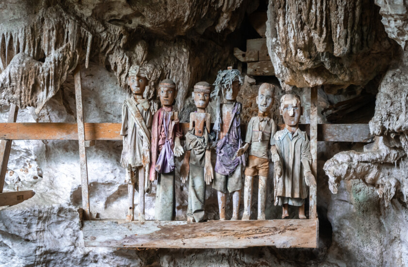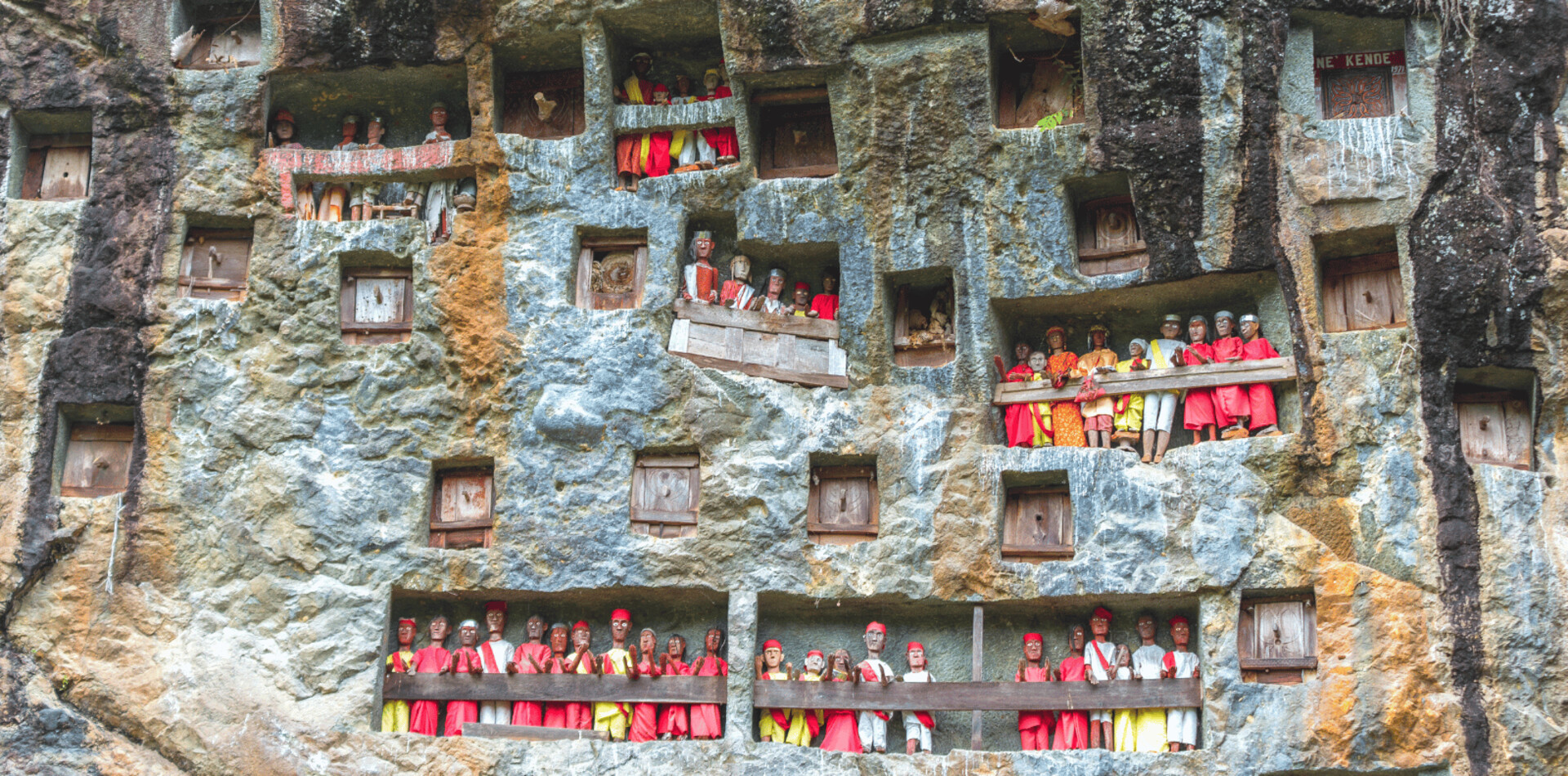 Grupa etniczna zamieszkująca rejon Tanah Toraja na południu Sulawesi otworzyła się na świat po długiej izolacji dopiero na początku ubiegłego wieku i do dziś przestrzega swoich odwiecznych wierzeń, rytuałów oraz tradycji. W otoczeniu wyjątkowych, niemal nietkniętych ręka człowieka krajobrazów Toradżanie zachowali unikatową i niespotykaną nigdzie indziej kulturę skupiającą się wokół śmierci. W tym regionie zobaczycie tradycyjne wioski z charakterystycznymi domkami na palach i półokrągłymi dachami, groby z odkrytymi czaszkami wiszące na skałach, figurki tau-tau przedstawiające zmarłe osoby oraz tajemnicze drzewa – dawne miejsca pochówku niemowląt. Istnieje duża szansa, że w trakcie naszej przygody trafimy na ceremonię pogrzebową, która jest traktowana przez Toradżan jako najważniejsze wydarzenie w życiu człowieka. Pogrzeby organizowane są z dużym rozmachem i zazwyczaj odbywają się kilka miesięcy lub lat po śmierci nieboszczyka. W tym czasie poszukuje się dogodnego terminu, żeby wszyscy członkowie rodziny mogli dotrzeć na ceremonię, a rodzina zmarłego mogła zebrać odpowiednie środki na organizację, W oczekiwaniu na pogrzeb ciało przechowuje się w dawnym domu zmarłego w trumnie lub (coraz rzadziej) jako mumię. Uroczystości pogrzebowe trwają zazwyczaj kilka dni i pojawia się na nich nawet kilkuset gości. Obowiązkowym punktem programu jest składanie ofiar ze zwierząt, głównie świń i bawołów.
